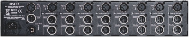Vorderseite Drehverstärkungsschalter: 0 dB, +10, +20, +30, +40 Transformatorsymmetrischer A- und B-XLR-Ausgang teilt Kanäle 1 bis 8 auf. Pin 3–-, Pin 2 +, Pin 1 nicht angeschlossen PFL-Schalter (Pre Fade Listening) 48-V-Phantomspeisungsschalter und LED Schalter und LED für Verbindung zum vorherigen Kanal –20-dB-Pad-Schalter und LED Kopfhörerpegelregler Kopfhörerbuchse 6 LED-PFL-Messung: -40, -12, -6, 0, +3 und +6 dB Status-LEDs zeigen an, dass PSX32 Backup/redundante Stromversorgung angeschlossen ist Beleuchteter Netzschalter Rack-Griffe Rückseite Symmetrische XLR-Eingangskanäle 1 bis 8. Pin 3 –, Pin 2 +, Pin 1 Masse Schalter für direkte Verbindung vom Eingang zum Hauptausgang Symmetrischer XLR-Hauptausgang (FOH) (gleiche Verkabelung wie Eingang) Kanäle 1 bis 8 Symmetrischer XLR-Monitor Ausgang (gleiche Verkabelung wie Eingang) Kanäle 1 bis 8 PFL-Eingangs- und Ausgangsschleifen-XLR-Anschlüsse. Pin 3 –, Pin 2 +, Pin 1 Masse Aux PSU 5-poliger XLR-Anschluss vom redundanten Netzteil PSU32. – Pin 1: + VDC, Pin 2: – VDC, Pins 3 und 4: Masse, Pin 5 +48 V IEC 3-poliger AC-Anschluss und integrierter Sicherungshalter. Ersetzen Sie die Sicherung nur durch den korrekten Wert: 220–240 V AC 1 Ampere, 100–120 V AC 2 Ampere.