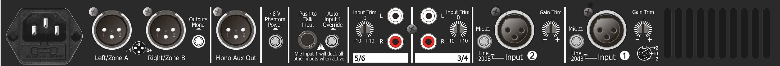 - 2 Stereo-Line-Eingänge (RCA) mit Trim- und Pegelreglern
