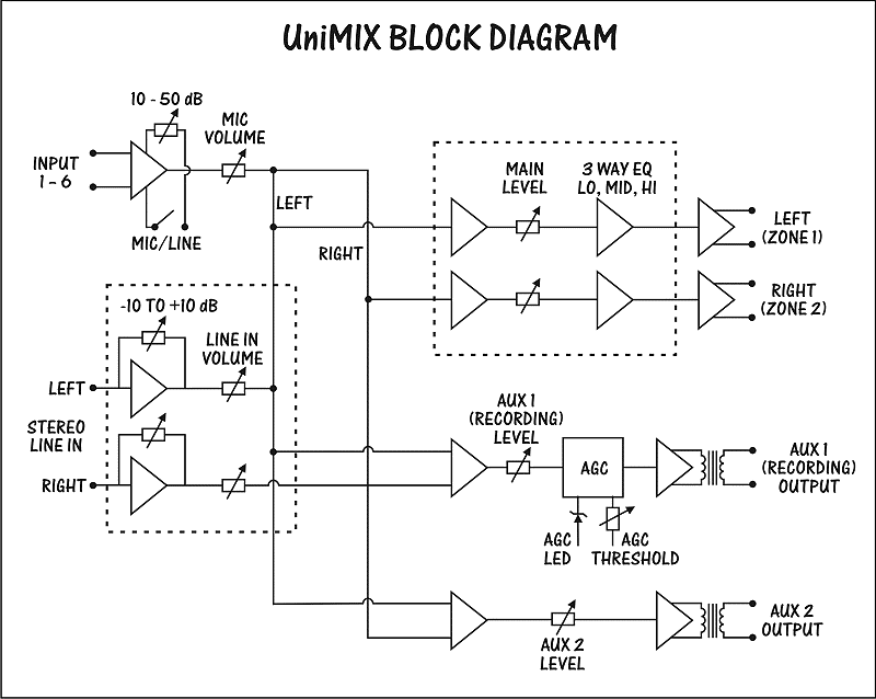 Heutzutage wird von immer mehr Bildungseinrichtungen wie Colleges, Universitäten und Gymnasien erwartet, dass sie herunterladbare Aufnahmen – Podcasts – von Vorlesungen und Kursen bereitstellen, auf die die Studenten jederzeit über das lokale Netzwerk zugreifen können. Diese Aufnahmen werden normalerweise von der Tonanlage des Klassenzimmers/Hörsaals aufgenommen und in Echtzeit auf einem Computer gespeichert. Problem 1: Es ist schwierig, den richtigen Aufnahmepegel zu erhalten, da die Pegelanforderungen sich von denen der Lautsprecher unterscheiden. Problem 2: Um einen konstanten Eingangspegel für den Computer aufrechtzuerhalten, ist eine kontinuierliche Überwachung erforderlich, um eine digitale Überlastung zu vermeiden. Die Lösung Wir stellen den neuen UniMIX von ARX vor: Sechs symmetrische XLR-Mikrofon-/Line-Eingangskanäle mit individuellen Pegelreglern sowie ein dedizierter Stereo-Cinch-Line-Eingangskanal. Jeder Mikrofon-/Line-Eingang verfügt über einen Pegel von unendlich bis +6 dB auf der Vorderseite sowie einen Eingangsverstärkungsregler von 10 bis 50 dB. Der Stereo-Line-Eingangskanal verfügt über einen Pegeltrimmregler von –10 bis +10 dB, um eine genaue Anpassung aller Line-Pegelsignale zu ermöglichen. Auf der Rückseite kann jeder der 6 elektronisch symmetrierten Mikrofon-Eingänge über einzelne Schalter auf Line umgeschaltet werden. Mehrere Master Für das Raumsystem hat der UniMIX zwei symmetrische XLR-Ausgänge mit 3-Wege-EQ und eigener Master-Pegelsteuerung. Der Aufnahmeausgang ist ein einzelner symmetrischer XLR-Ausgang, der durch einen Transformator isoliert ist, um Erdschleifen und damit verbundenes Rauschen zu verhindern. Automatische Verstärkungsregelung Der Aufnahmemaster hat auch seine eigene automatische Verstärkungsregelungsschaltung. Speziell angepasste Parameter stellen sicher, dass die Pegel unabhängig von der Mikrofonplatzierung und der Benutzertechnik konstant bleiben. Das Ergebnis ist ein konstanter Pegel für die Aufnahme, der für eine bessere Verständlichkeit sorgt und die Notwendigkeit einer ständigen Überwachung sowie das Risiko von Überlastung und Verzerrung überflüssig macht. Die letzte Master-Steuerung speist das Hauptsignal in einen transformatorisolierten symmetrischen XLR-Hilfsausgang ein. Dieser kann für zukünftige Erweiterungen, Fernüberwachung oder zur Speisung eines drahtlosen Senders oder eines anderen Geräts verwendet werden. Globale Phantomspeisung ist an allen Mikrofoneingängen mit einem Schalter auf der Rückseite mit zugehöriger Status-LED auf der Vorderseite verfügbar. Großer Dynamikbereich Intern wurde sorgfältig auf das Design des Signalpfads geachtet und Präzisionskomponenten verwendet, die in High-End-Mischpulten zu finden sind. Dies hat zu einem Gerät mit sehr großem Dynamikbereich geführt. Der UniMIX hat genügend Spielraum, um mit den heißesten Leitungssignalen fertig zu werden, und übertrifft die Spezifikationen für digitales Rauschen. Universelle Wechselstromversorgung Der Wechselstrombereich beträgt universell 100 bis 120 V oder 220 bis 240 V Wechselstrom und wird über einen standardmäßigen dreipoligen IEC-Stecker mit eingebauter Sicherung und Spannungswechselschalter an das Gerät angeschlossen. Spezifikationen: Eingangsimpedanz Mikrofon: 4 K Ohm symmetrisch, Line 22 K Ohm unsymmetrisch Eingangsverstärkung Mikrofon: variabel 10 dB bis 50 dB mit hinterem Trimmregler, Mikrofon-/Line-Schalter -20 dB Ausgangspegel (max.) +21 dB AGC-Schwellenwert –50 bis –20 dB AGC-Ausgangsverstärkung –20 bis +20 dB Phantomspeisung: +48 VDC umschaltbar an allen Mikrofoneingängen Ausgangssignal/-rauschen (bei Einheitsverstärkung) -90 dB A-gewichtet, alle Eingänge bei Einheit, Master bei Einheit Dynamikbereich 115 dB Master-Ausgangs-EQ Niedrig 100 Hz 15 dBCut/Boost Mittel 800 Hz 15 dBCut/Boost Bell, Broad Q Hoch 10 KHz 15 dBCut/Boost Master-Ausgänge elektronisch symmetriert XLR 300 Ohm Line-Pegel symmetrische Ausgangsanschlüsse Stecker XLR: Pin 1 Masse, Pin 2 +, Pin 3 – Frequenzgang 20 Hz – 20 kHz ± 1 dB Verzerrung (bei Einheitsverstärkung unter 0,0035 %, 100 Hz bis 10 kHz Eingangsanschlusstyp Mikrofon/Leitung – Amphenol XLR weiblich, Hi Z-Eingang – Phono (RCA-Typ) Ausgangsanschlusstyp Amphenol XLR männlich Aufnahmeausgangsanschlusstyp Amphenol XLR männlich Bedienelemente auf der Vorderseite Individuelle Pegelregler für jeden Eingangskanal – unendlich über 0 dB bis +6 dB Individuelle Verstärkungsregler für jeden Eingangskanal, 10 bis 50 dB Stereo-Line-In-Pegel- und Trimmregler Master-Ausgang 3-Wege-EQ und Pegelregler Systemstatus-LEDs Recording-Master-Pegelregler und automatische Verstärkungsregelungs-Schwellenwerttrimmung Zusätzlicher Master-Ausgangsregler Markierungsfeld zum Beschriften der Eingangskanäle Rückseite 6 x symmetrische XLR-Buchseneingänge, verkabelt Pin 1 Audio-Masse, Pin 2 +, Pin 3 – Stereo-Line-Eingänge vom Typ Cinch Transformatorisolierter symmetrischer XLR-Aufnahmeausgang Linke und rechte symmetrische XLR-Steckerausgänge, verkabelt Pin 1 Audio-Masse, Pin 2 +, Pin 3 – Transformatorisolierter zusätzlicher Master-XLR-Ausgang Globaler Mikrofoneingang Phantomspeisungsschalter Abnehmbarer AC-Eingangsstecker vom Typ IEC mit eingebauter Sicherung Hersteller: